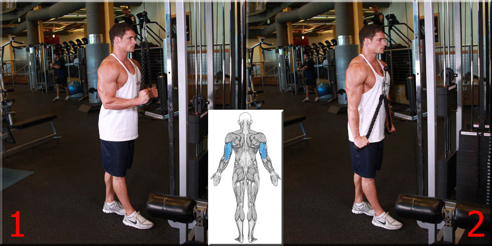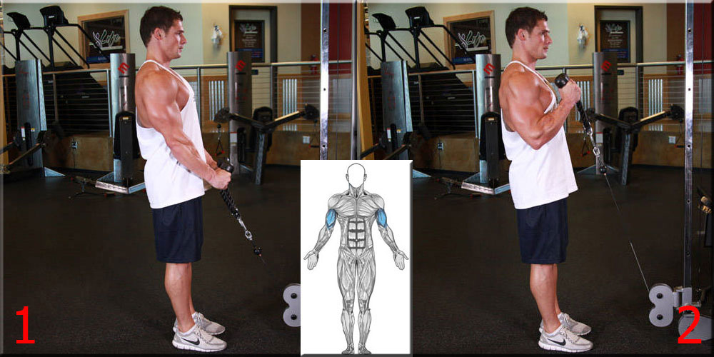 Бицепс Техника выполнения упражнения Закрепите канат на нижнем ролике. Установите рабочий вес. Встаньте лицом к тренажеру на расстоянии около полуметра. Возьмитесь за канат закрытым хватом, встаньте прямо. Ноги на уровне таза, взгляд — вперед. Выполняя упражнение, старайтесь держать туловище неподвижно. Локти прижмите к туловищу и не отрывайте их во время выполнения упражнения.