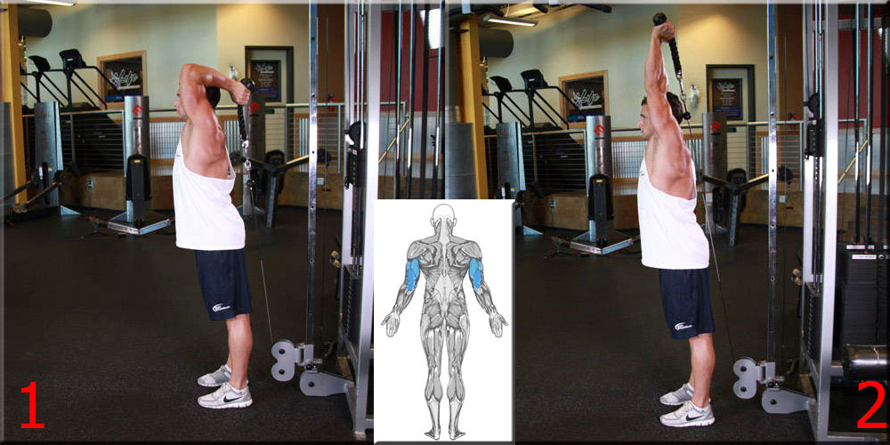 - Напрягайте трицепсы и выпрямляйте руки вверх над головой. Следите за тем, чтобы верхний участок рук был при этом не подвижен.